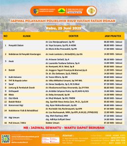 Pelayanan Klinik RSUD Sultan Fatah Kabupaten Demak pada Rabu, 25 Juni 2025 admin Juni 25, 2025 News 0 Komentar Sahabat Sultan berikut kami informasikan jadwal Pelayanan Klinik RSUD Sultan Fatah Kabupaten Demak pada Rabu, 25 Juni 2025