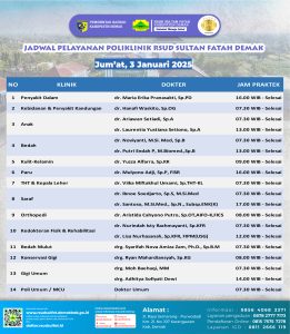 Pelayanan Klinik RSUD Sultan Fatah Kabupaten Demak pada Kamis, 9Â Januari 2025 admin Januari 9, 2025 News 0 Komentar Sahabat Sultan berikut kami informasikan jadwal Pelayanan Klinik RSUD Sultan Fatah Kabupaten Demak pada Kamis, 9Â Januari 2025