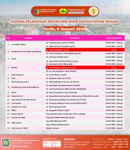 Pelayanan Klinik RSUD Sultan Fatah Kabupaten Demak pada Senin, 6 Januari 2025 admin Januari 6, 2025 News 0 Komentar Sahabat Sultan berikut kami informasikan jadwal Pelayanan Klinik RSUD Sultan Fatah Kabupaten Demak pada Senin, 6 Januari 2025