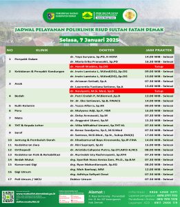 Pelayanan Klinik RSUD Sultan Fatah Kabupaten Demak pada Selasa, 7 Januari 2025 admin Januari 7, 2025 News 0 Komentar Sahabat Sultan berikut kami informasikan jadwal Pelayanan Klinik RSUD Sultan Fatah Kabupaten Demak pada Selasa, 7 Januari 2025