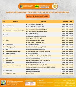 Pelayanan Klinik RSUD Sultan Fatah Kabupaten Demak pada Rabu, 8 Januari 2025 admin Januari 9, 2025 News 0 Komentar Sahabat Sultan berikut kami informasikan jadwal Pelayanan Klinik RSUD Sultan Fatah Kabupaten Demak pada Rabum 8 Januari 2025 .
