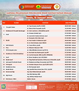 Pelayanan Klinik RSUD Sultan Fatah Kabupaten Demak pada Senin,13 Januari 2025 admin Januari 13, 2025 News 0 Komentar Sahabat Sultan berikut kami informasikan jadwal Pelayanan Klinik RSUD Sultan Fatah Kabupaten Demak pada Senin,13 Januari 2025