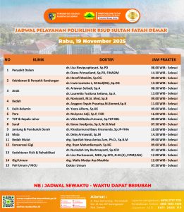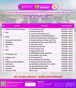 Pelayanan Klinik RSUD Sultan Fatah Kabupaten Demak pada Kamis, 26 November 2025 admin November 27, 2025 News 0 Komentar Sahabat Sultan berikut kami informasikan jadwal Pelayanan Klinik RSUD Sultan Fatah Kabupaten Demak pada Kamis, 26 November 2025